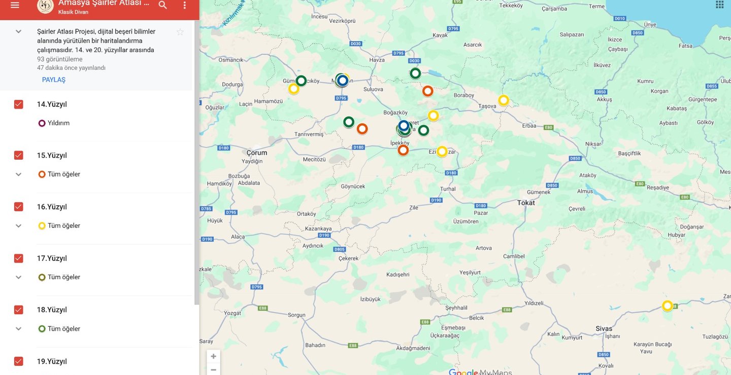 Amasya Şairler Atlası Projesi, dijital beşerî bilimler alanında yürütülen bir haritalandırma çalışmasıdır. 14. yüzyıl ila 20. yüzyıllar arasında Amasya'da doğmuş, yaşamış ya da yolu bir şekilde bu şehirden geçmiş 122 şairi kapsamaktadır. Şairlerin hayatları, edebî faaliyetleri ve mekânsal izleri görselleştirmiştir. Proje, kültürel mirası erişilebilir kılarak edebiyat ile mekân ilişkisini akademik zeminde sunmayı hedeflemektedir.
