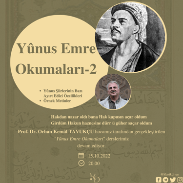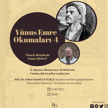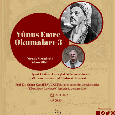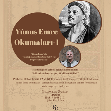 Yûnus Emre Okumaları, Prof. Dr. Orhan Kemâl Tavukçuoğlu hocamızla gerçekleştirdiğimiz toplam dört dersten oluşmaktadır. Derslerde; Yûnus Emre'nin hayatı, adı, yaşadığı coğrafya, onu besleyen kaynaklar ve şiirinin özellikleri üzerinde durulmuş ardından örnek şiirleri şerh edilmiştir. Bu dersler, ekip arkadaşlarımız Fatma Türk ile İlknur Cevher tarafından 2023'te kitap olarak hazırlanmış ve DBY Yayınları tarafından okuyuculara sunulmuştur.