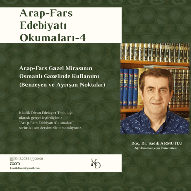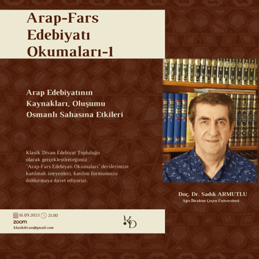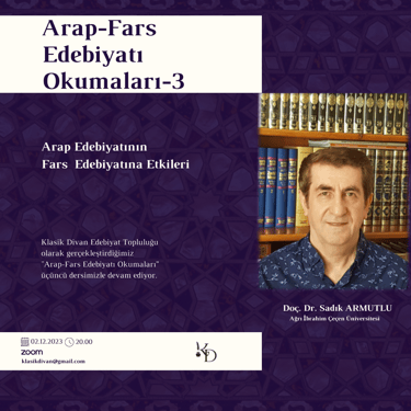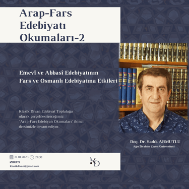 Arap-Fars Edebiyatı Okumaları, Doç. Dr. Sadık Armutlu hocamızla gerçekleştirdiğimiz toplam dört dersten oluşmaktadır. Derslerde; Arap edebiyatının doğuşu, cahiliye ve İslâmi dönem şiir geleneği, Emevî, Abbasî ve Selçuklu toplumlarında edebiyat ve şiir, Fars edebiyatının Osmanlı edebiyatına etkileri gibi birçok konu üzerinde durulmuştur. Örnek metinler üzerinden konu detaylı olarak anlatılmıştır. Bu dersler, ekip arkadaşlarımız Ayfer Turan ile Sevnur Gizem Doruk tarafından kitap olarak hazırlanmaktadır.