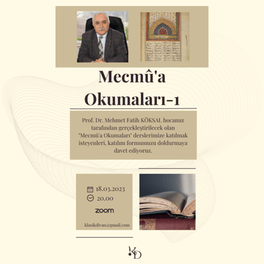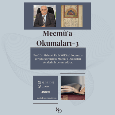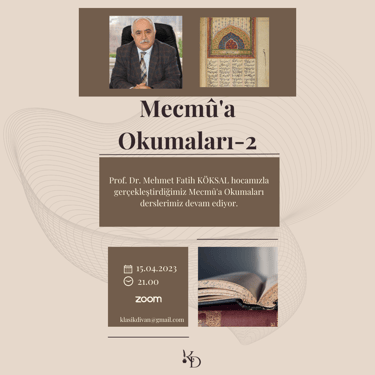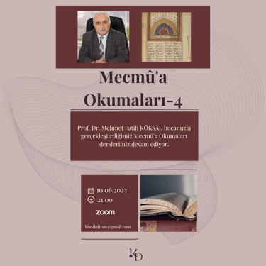 Mecmua Okumaları, Prof. Dr. Mehmet Fatih Köksal hocamızla gerçekleştirdiğimiz toplam dört dersten oluşmaktadır. İlk iki derste; mecmualar ve cönkler hakkında gerekli tüm malumat verildikten sonra MESTAP (Şiir Mecmualarının Sistematik Tasnifi Projesi) tanıtılmış ve projenin nasıl olması gerektiği katılımcılara detaylı bir şekilde anlatılmıştır. Son iki derste ise Köksal'ın şahsî kütüphanesinde yer alan mecmua ve cönk örneklerinden metin okumaları yapılmıştır. Bu dersler, ekip arkadaşlarımız Havva Aşı ile Hakan Sönmez tarafından 2023'te kitap olarak hazırlanmış ve DBY Yayınları tarafından okuyuculara sunulmuştur.