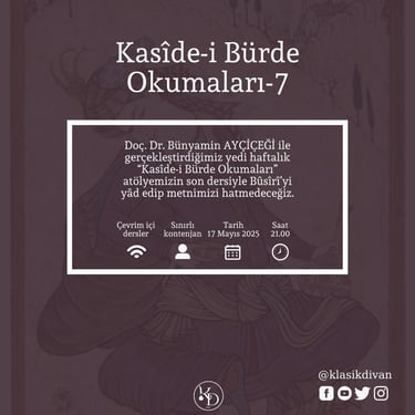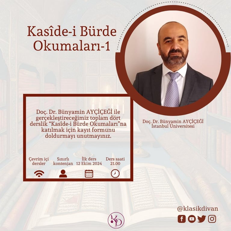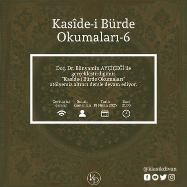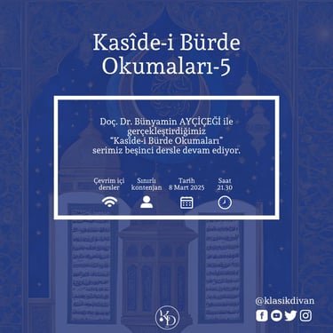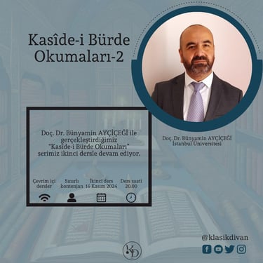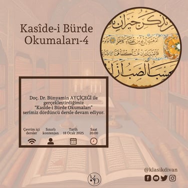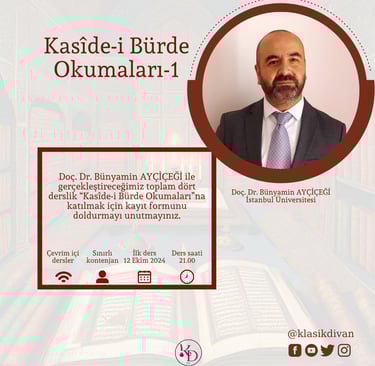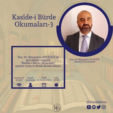 Kaside-i Bürde Okumaları, Doç. Dr. Bünyamin Ayçiçeği’nin öncülüğünde yürütülen ve yedi hafta süren bir ders serisidir. Bu derslerde, İmam Bûsîrî’nin klasik Arap edebiyatının en önemli metinlerinden biri olan Kaside-i Bürde’si, Sezai Karakoç’un Türkçe çevirisiyle karşılaştırmalı olarak okunmuş ve değerlendirilmiştir.