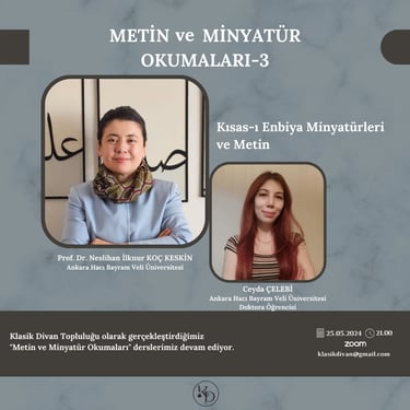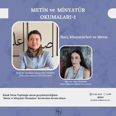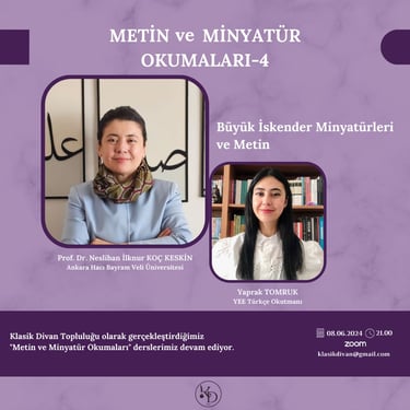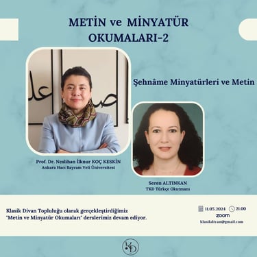 Metin ve Minyatür Okumaları, Prof. Dr. Neslihan İlknur Koç Keskin hocamız ve doktora öğrencileri; Saba Özdemir, Seren Altınkan, Ceyda Çelebi ve Yaprak Tomruk'un sunumlarıyla gerçekleştirdiğimiz toplam dört dersten oluşmaktadır. Derslerde; Osmanlı şairlerinin kaleme aldığı birçok manzumenin yazma eserlerde yer alan minyatürleriyle ilişkileri üzerinde durulmuştur. Bu dersler, Keskin ve öğrencileri tarafından kitaplaştırılmıştır.