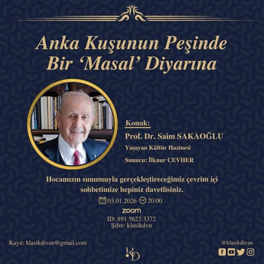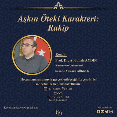 Ekranda yer alan görseller, 2021'de başlayıp hâlâ devam ettiğimiz tüm sohbetlerimizin afişleridir. Bu zamana kadar gerçekleştirdiğimiz sohbetlerimizin video kayıtları, "Klasik Divan Youtube Kanalı"mızda mevcuttur. Sayfanın sol alt köşesinde bulunan sosyal medya sembollerinden kanalımıza ulaşabilir, sohbetlerimizi dinleyebilirsiniz. Programlarımız, önce konu anlatımı ardından soru cevap şeklinde düzenlenmiştir.